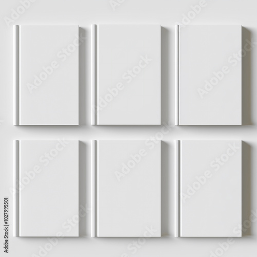 Mockup, six white closed mock-up books displayed on a white backdrop, focusing on their spines and covers, top view