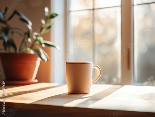 Mockup white ceramic mug on a wooden table near window in minimalistic cinematic style