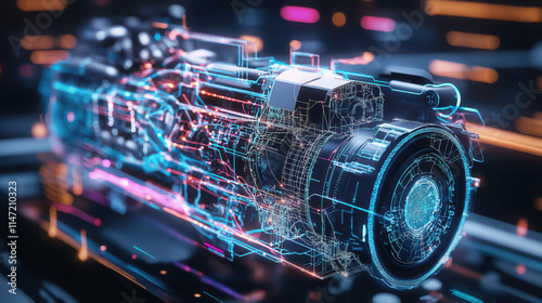 Model Build of an Engine Connected by Technology with Superimposed Data Connections Flowing from the Base to the Top in Futuristic Colors