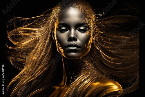 Model girl with golden make-up and long golden hair, on a black background. Golden glowing skin and flowing hair. art portrait, Generative AI