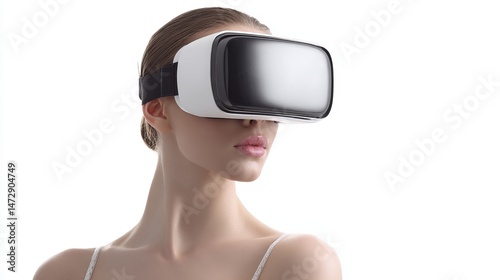 Model in VR headset isolated on white background 3D rendering of virtual reality scene Technology focus