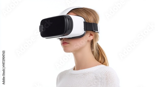 Model in VR headset isolated on white background 3D rendering of virtual reality scene Technology focus