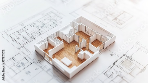 model of a house interior on architectural blueprints, showcasing modern design and spacious layout, perfect for design projects.