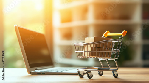 Model shopping cart and laptop keyboard on wood table