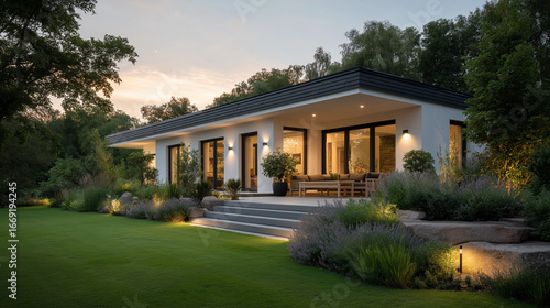 Modern Abode in Evening Light: A contemporary home stands bathed in the soft glow of the setting sun.