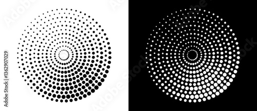 Modern abstract background. Halftone dots in circle form. Round logo, design element or icon. Vector dotted frame. A black figure on a white background and an equally white figure on the black side.