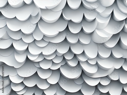 modern abstract piece of white geometric shapes resembling scales or clouds, arranged in a layered pattern to create depth and a visually calming effect