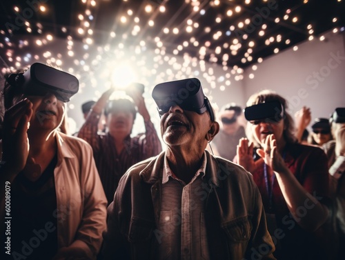 Modern Aging. Candid shot of a group of senior citizens using VR headsets to experience a virtual world. Generative AI