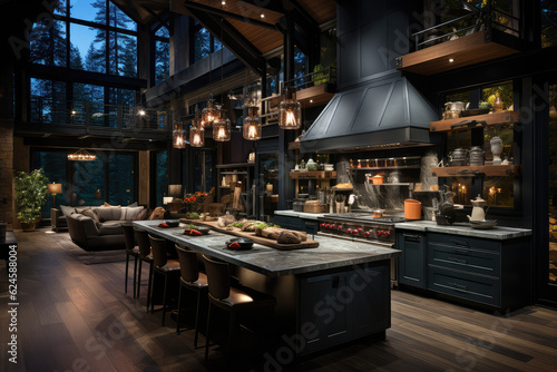 Modern and stylish interior design of a kitchen with a touch of luxury and elegance. Created with generative AI technology.