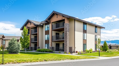 Modern Apartment Building with Landscaping and Blue Sky Background