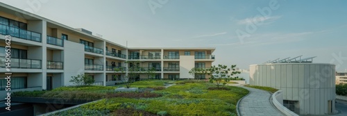 Modern apartment complex with landscaped courtyard and rooftop structures.