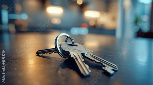 modern apartment keys resting on sleek countertop symbolizing new beginnings in real estate soft focus background of contemporary living space warm lighting enhancing sense of home