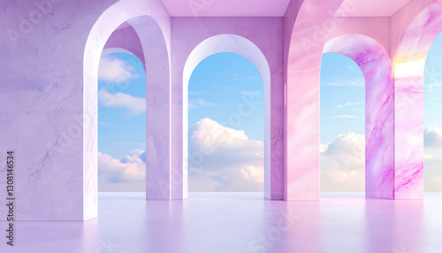 Modern architectural arches digital space 3d render vibrant colors aesthetic design serene environment