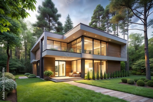 Modern Architectural Design A Luxurious Residence Nestled Within a Verdant Forest Setting at Dusk