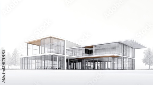 Modern architectural design, glass house, white building, blueprint style rendering.
