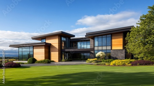 Modern architectural design of a luxury house with large windows and landscaped garden under blue sky