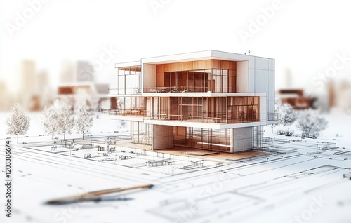 Modern Architectural Design of a Stylish Building in Soft Focus with Blueprint Background for Creative and Innovative Business Settings
