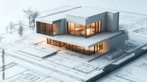 Modern architectural model of a house placed on top of blueprints. The house features large windows and contemporary design elements, and is illuminated from within.