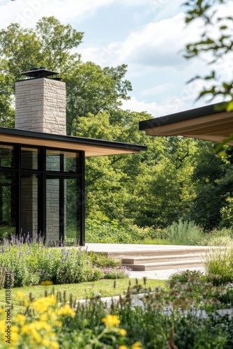 Modern architecture blends with nature in a tranquil garden setting with vibrant flowers and lush greenery during the day