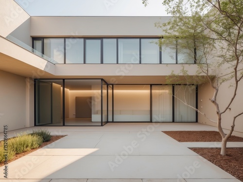 Modern architecture, courtyard with sleek design and minimal landscaping features.