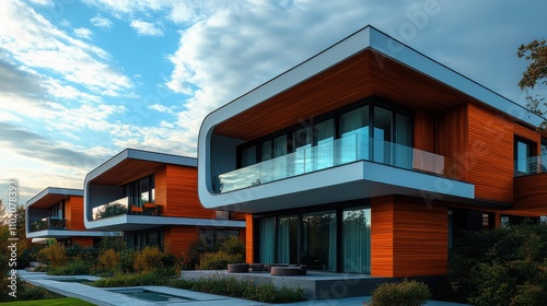 Modern architecture showcases wooden houses surrounded by lush greenery at sunset