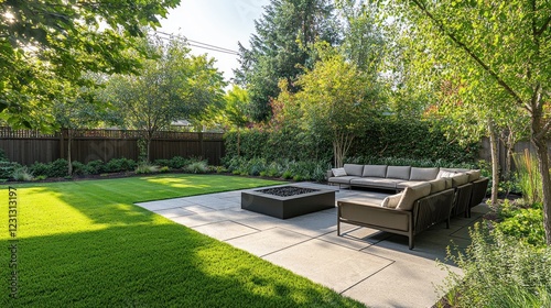 Modern backyard patio with fire pit, sectional sofa, and lush landscaping.