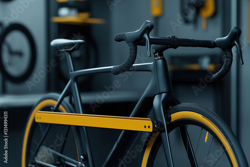 Modern bicycle with yellow accents in a sleek workshop environment