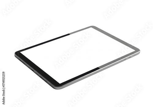 Modern black digital tablet with matte finish and silver trim, blank white screen, angled right on a transparent background with copy space, soft shadow, concept for digital content