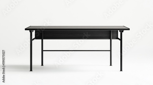Modern black rectangular desk with simple metal legs and a wooden top.