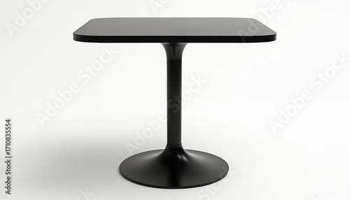 Modern black square table with rounded corners and pedestal base isolated on white background. Minimalist furniture design for contemporary home or office interiors. Clean simple shape.