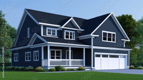 Modern blue house with white trim and garage, surrounded by lush greenery and trees