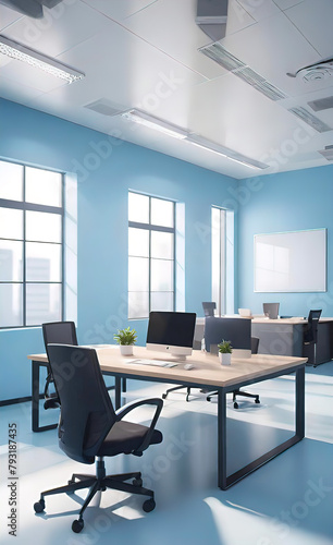 modern bright office with large panoramic windows and plants for environmental and psychological relaxation, work in a modern office