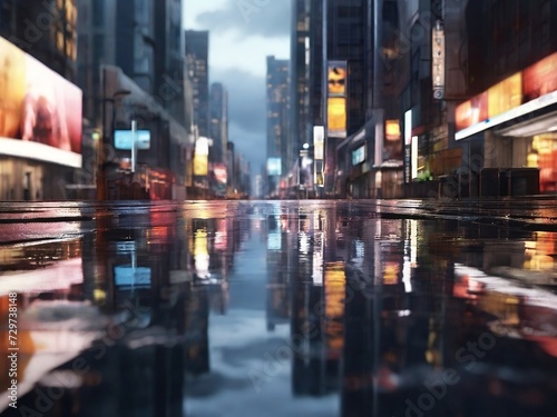 modern building in the city center with billboards, light reflection from puddles on the street. beautiful landscape illustration. background for poster, banner, web, social media. ai generative