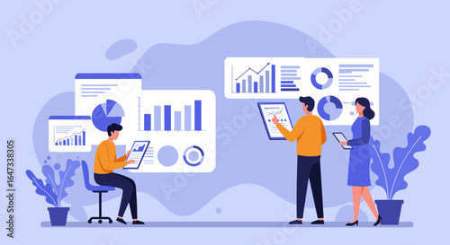 Modern business analytics teamwork with diverse graphs and charts