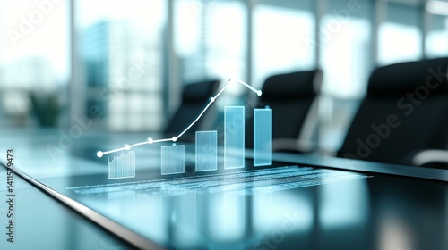 Modern business data graph floating over blurred silhouettes near panoramic windows, clear line emphasis and minimal distraction