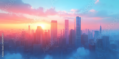 Modern business skyscrapers at sunrise, financial district background, graphic perspective