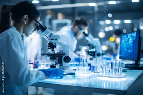 Modern, bustling laboratory with diligent scientists, microscopes, and sleek test tubes.