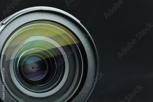Modern camera lens on black table, closeup. Space for text