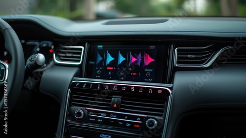 Modern Car Dashboard with Advanced Audio Functions and Controls Displayed on Screen in a Luxurious Vehicle Interior