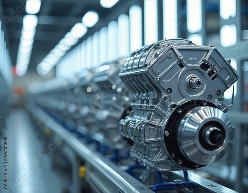 Modern car engine production line. Shiny stainless steel components on manufacturing assembly line. Machinery, technology, automation, industrial process detail. Factory workshop.