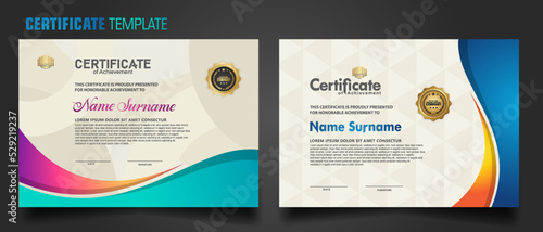 Modern certificate template with dynamic colorful waving shape on ornament pattern background