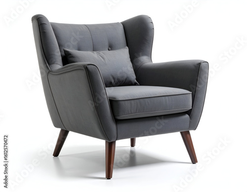 Modern charcoal armchair featuring subtle curves and comfortable firm padding, isolated and centered on a pristine white background.