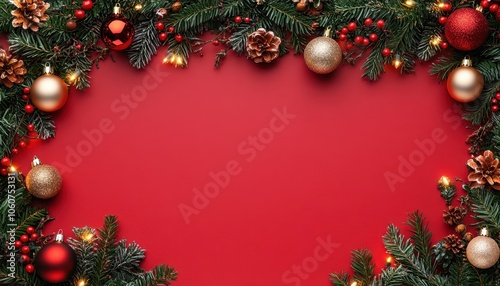 Modern Christmas flat lay with festive ornaments on a red background