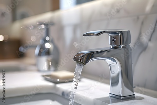 Modern Chrome Faucet with Flowing Water in a Stylish Bathroom Setting