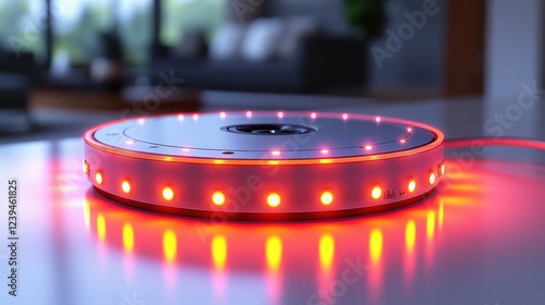 Modern circular device with glowing red lights on a table in a stylish living room setting