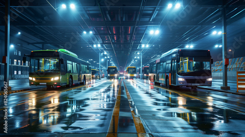modern city bus terminal, many buses at station, public transport depot and parking, EV electric vehicle transportation