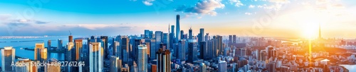 modern city skyline at sunset with blue sky and water in the background.