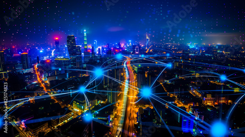 Modern city with wireless network connection and city scape concept. Wireless network and Connection technology concept with city background at night.