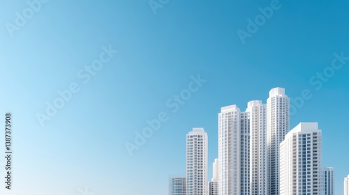 Modern cityscape with tall buildings against a clear blue sky. Detailed view of architectural design, showcasing modern high-rises in a vibrant urban setting