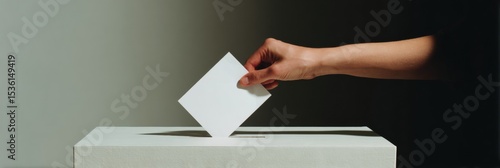 Modern Civic Engagement Hand Inserting White Ballot into Minimalist Ballot Box for Transparent Voter Participation and Democratic Empowerment